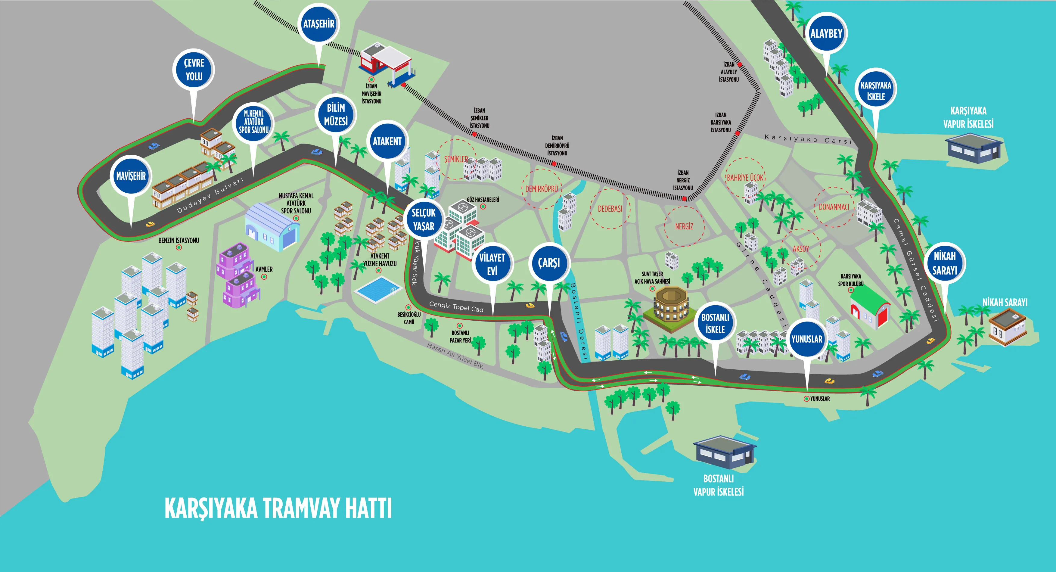 İzmir tramvay durakları Karşıyaka – Yeşil Hat için şöyledir: