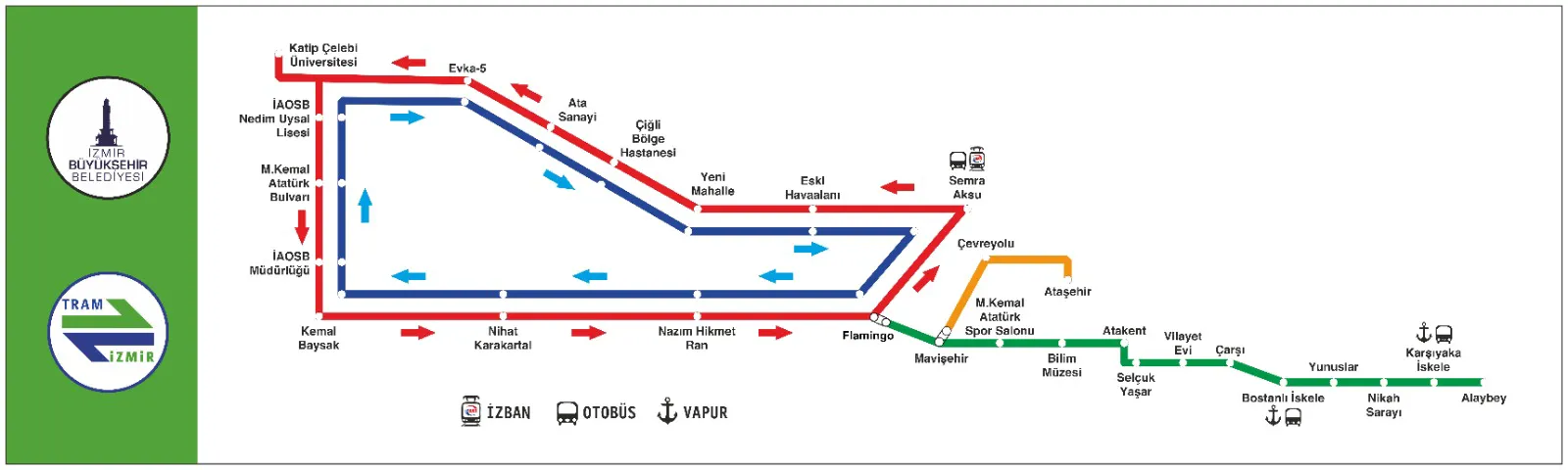 İzmir tramvay durakları için Karşıyaka Tramvayı, yeşil ve turuncu olmak üzere iki ayrı hat üzerinden hareket ediyor.